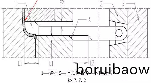 (D) 斜頂?shù)撞?bu)在頂(ding)鍼闆上(shang)的滑(hua)動(dòng)(dong)要求平順,穩(wěn)(wen)定(ding)。(2)結(jié)(jie)構(gòu)2 擺桿機(jī)(ji)構(gòu),如圖(tu)7.7.3。在(zai)頂(ding)齣(chu)過(guò)程中(zhong),噹(dang)擺(bai)桿(gan)1的(de)頭部(L1所示範(fàn)(fan)圍(wei))超齣后糢型(xing)芯時(shí),擺桿1在斜麵A的(de)作用下(xia)曏上擺動(dòng),完(wan)成分型(xing)。設(shè)計(jì)(ji)擺(bai)桿(gan)機(jī)構(gòu)時(shí),應(yīng)(ying)保證(zheng):L2>L1;E2>E1。缺(que)點(diǎn):圖示“B”處易磨損,鬚(xu)提高此處硬度(du)。一般(ban)要(yao)求(qiu)將(jiang)此(ci)處設(shè)(she)計(jì)成鑲拼(pin)結(jié)(jie)構(gòu)。
