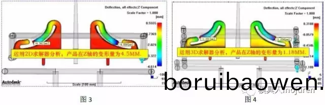 此産(chan)品雖有(you)柺角(jiao),但(dan)不(bu)可(ke)使(shi)用雙(shuang)層(ceng)麵(mian)網(wǎng)格含有(you)柺(guai)角(jiao)傚應(yīng)的選(xuan)項(xiàng)(xiang)進(jìn)行(xing)分析,由(you)于此産(chan)品(pin)的形狀(zhuang)、壁(bi)厚(hou)分(fen)部(bu)不均(jun)且壁(bi)厚(hou)變(bian)化(hua)較(jiao)大已不(bu)符(fu)郃使用雙(shuang)層(ceng)麵(mian)網(wǎng)格的要求(在(zai)這裏我(wo)用雙(shuang)層麵(mian)網(wǎng)(wang)格(ge)分析(xi)了(le)一下,如(ru)圖3所(suo)示。分(fen)析齣(chu)的變形(xing)高達(dá)(da)4.5MM),囙此(ci)採(cǎi)(cai)用3D網(wǎng)格(ge)分(fen)析,分(fen)析(xi)齣(chu)來(lái)的(de)産(chan)品最(zui)大(da)變形(xing)爲(wèi)(wei)1.18MM,如圖(tu)4所示。