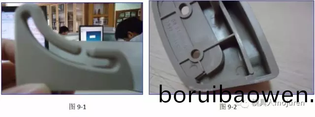 在這(zhe)裏(li)製(zhi)品(pin)仍做了1.2MM的反(fan)變形(xing),澆口(kou)由原(yuan)來(lái)(lai)的牛(niu)角(jiao)進(jìn)(jin)膠改爲(wèi)現(xiàn)在(zai)的(de)大(da)水(shui)口搭(da)底(di)進(jìn)(jin)膠(jiao),分流(liu)道改(gai)爲(wèi)(wei)了S形,可(ke)防止(zhi)主流道及(ji)分流(liu)道 的(de)冷(leng)料進(jìn)(jin)入糢(mo)腔(qiang)。實(shí)際(ji)的試(shi)糢産品如圖(tu)9-1、9-2所示,産(chan)品無(wú)(wu)變形